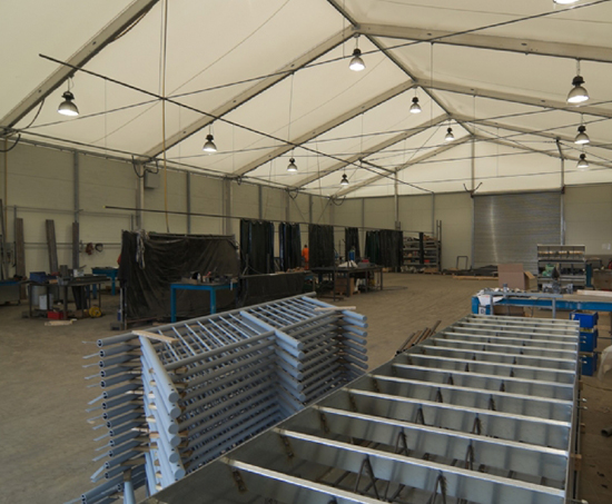 华烨篷房设计师并根据当地近50年的风雪情况,再通过风力测试为客户提供了一个20.00 m x 30.00 m的临时制造车间篷房,屋檐高度为5.20 m,配备了我们的节能热屋顶系统。