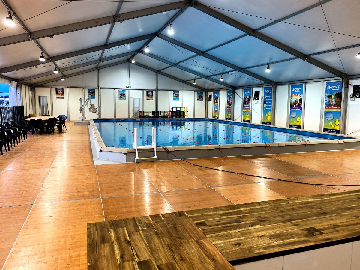 解决方案:华烨篷房根据客户的需求和场地的大小并提供宽15米,长25米,侧高3米的空间,并且在整个游泳池篷房上使用了多种配件进行改造,如ABS实心墙、门单元、双层玻璃门和地板系统。